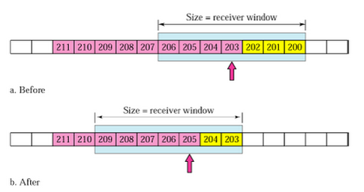 - Before : 203 ~ 204를 전송하면 수신측에서는 확인 응답 203을 보내고, 송신측은 이를 받아 after 상태와 같이 수신 윈도우를 203 ~ 209 범위로 이동