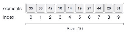 - 배열의 크기는 10이므로 10개의 요소를 저장할 수 있다.
