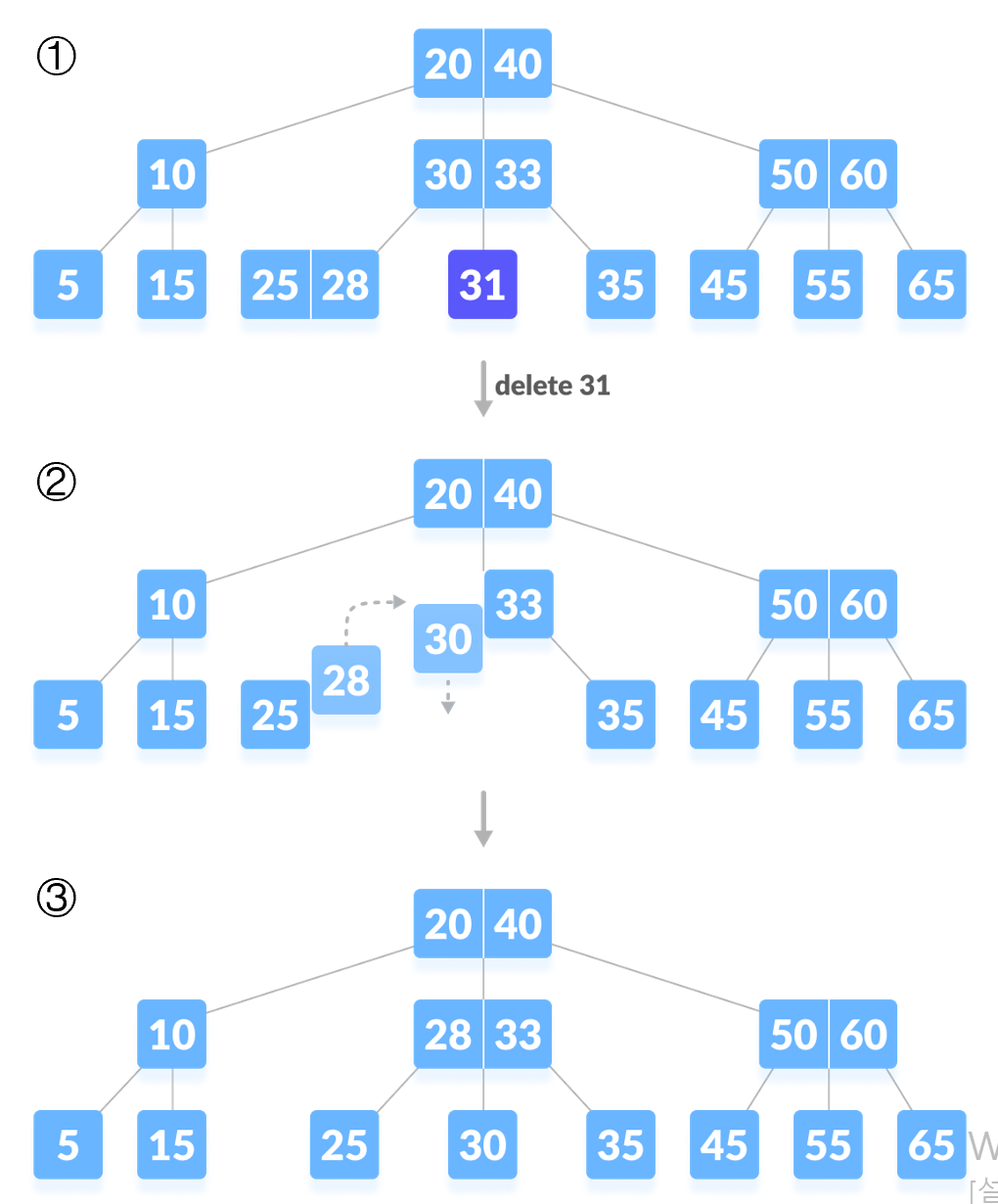 - 31을 삭제하기 위해선 최소한의 키수보다 작아지기 때문에 재조정을 해야한다.