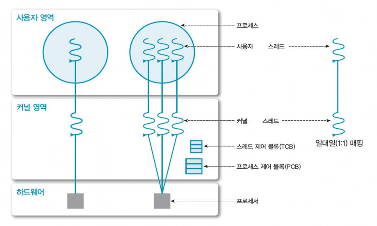 - 사용자 스레드와 커널 스레드가 1:1 매핑이 되었있다.