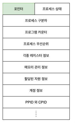 - 페이지 테이블, 스케줄링 큐 포인터, 소유자, 부모 등