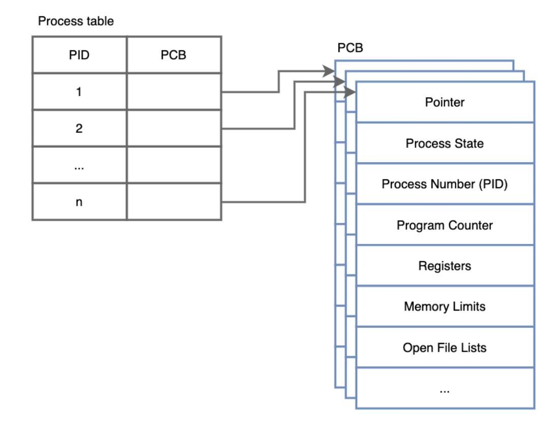 - 운영체제는 빠르게 PCB에 접근하기 위해 프로세스 테이블을 사용하여 각 프로세스의 PCB를 관리한다