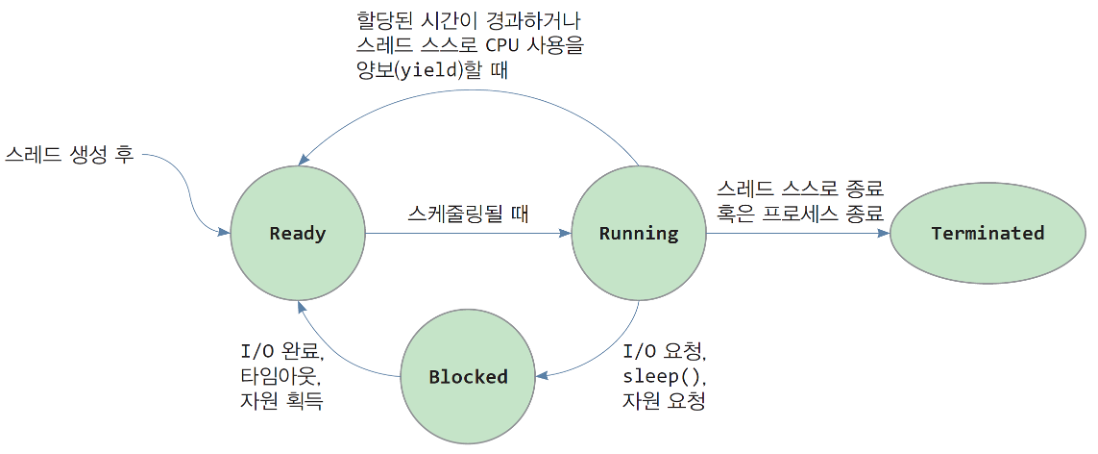 - 스레드는 생성, 실행, 종료, 소멸의 상태를 거치며 실행된다.