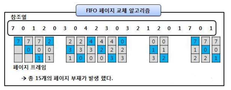 - 메모리에 먼저 올라온 페이지를 먼저 내보내는 알고리즘