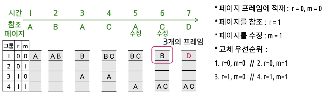 - 참조 비트 : 페이지가 참조되지 않았을 때 0, 호출되었을 때 1 (모든 참조비트를 주기적으로 0으로 변경)