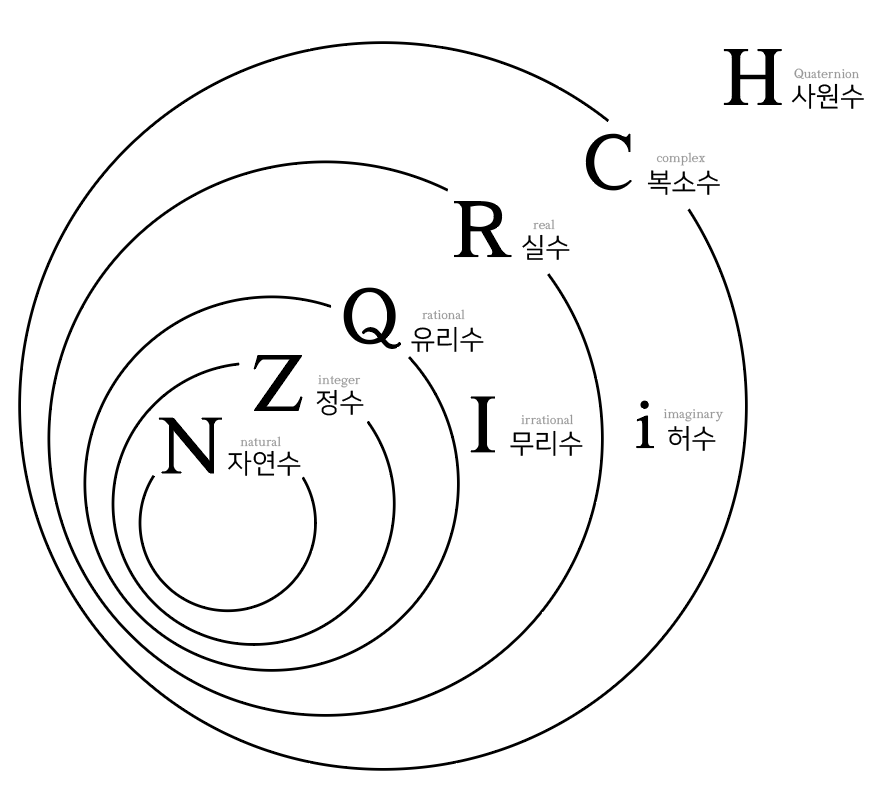 - C (복소수) : 실수와 제곱하면 -1이 되는 허수 단위 i를 조합해 a+bi(a, b는 실수) 형태로 표현하는 수의 집합