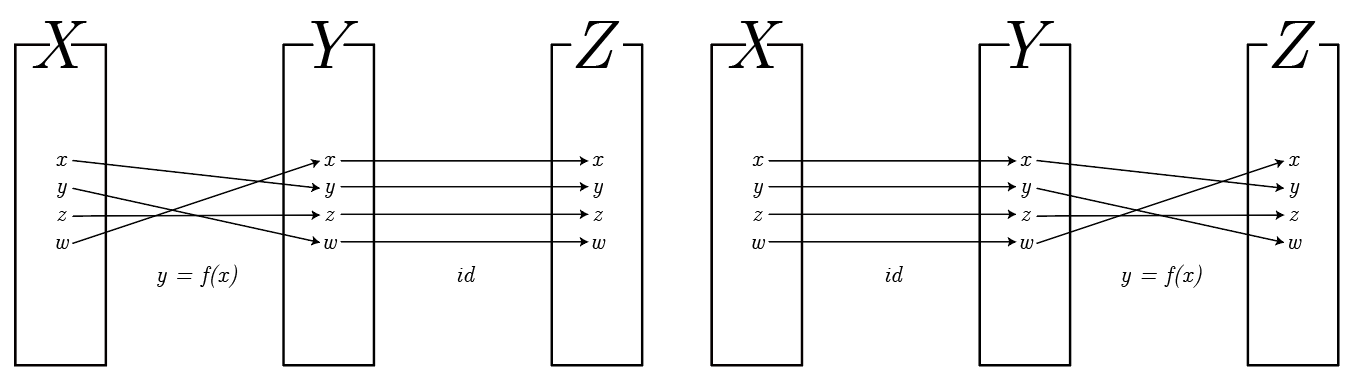 - 왼쪽 그림을 수식으로 나타내면 id · f = f이고 오른쪽을 수식으로 나타내면 f · id = f가 된다.