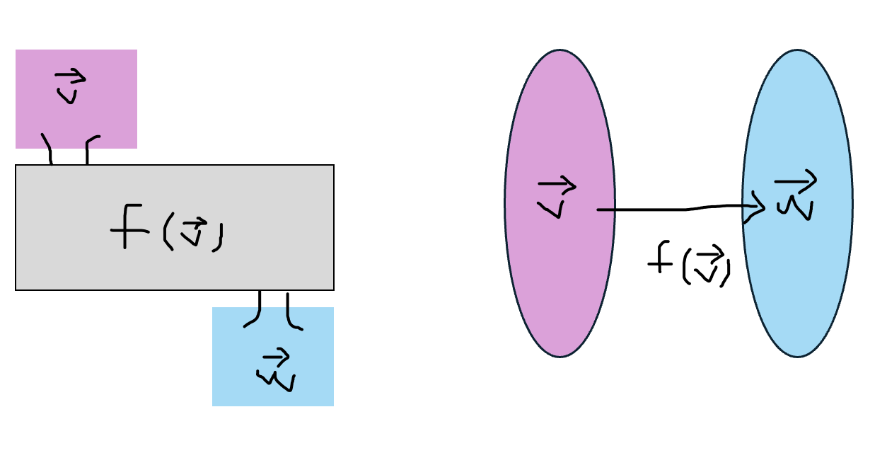 - 정의역에 해당하는 벡터 공간을 V, 그 원소를 v로, 공역에 해당하는 벡터 공간을 W, 그 원소를 w로 표시하고 두 벡터 공간의 대응관계를 표현하면 다음과 같다.