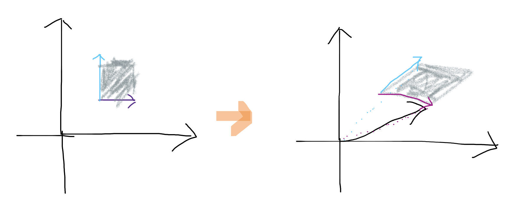 - 전단 변환은 위 그림처럼 표준기저벡터 e1을 고정시킨 상태에서 옆으로 밀어 공간을 기울이는 특징을 지닌다.