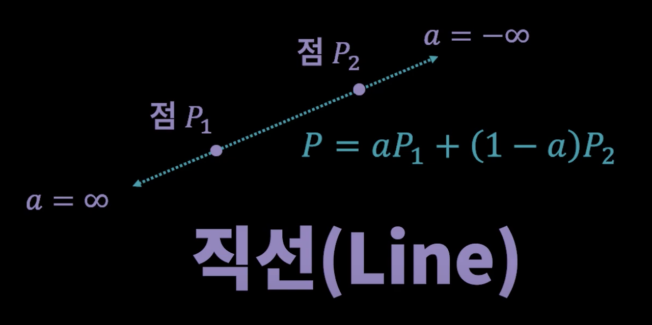 - 어파인 결합으로 생성되는 점을 모두 모으면 두 점 P1과 P2를 지나는 무한한 긴 선이 만들어질 것