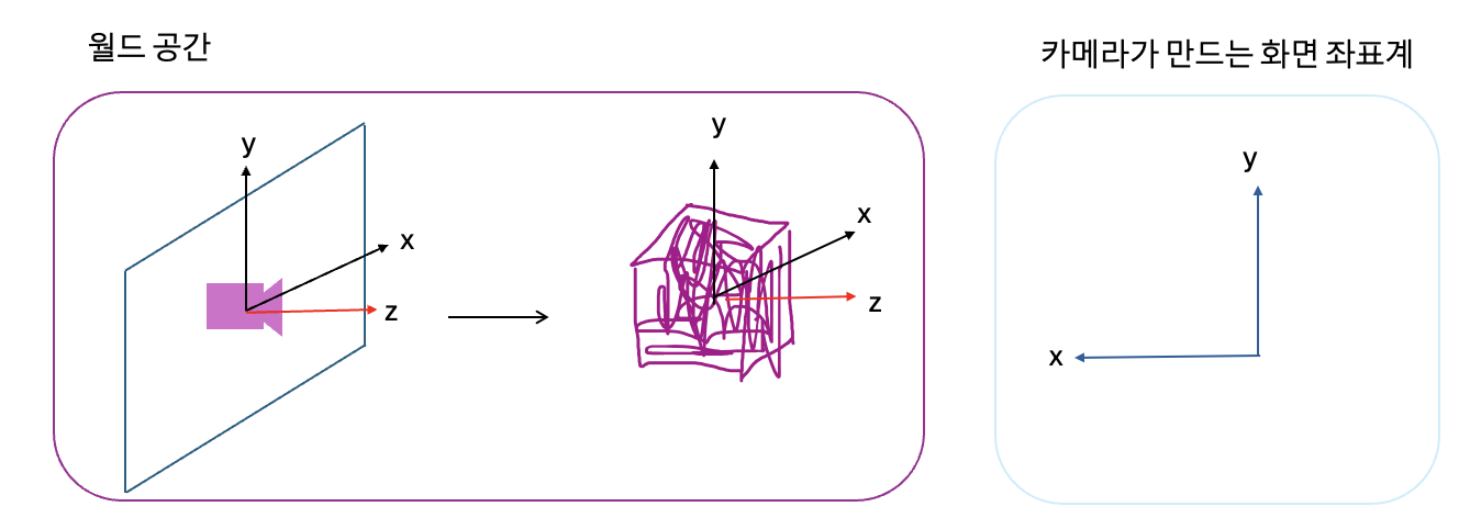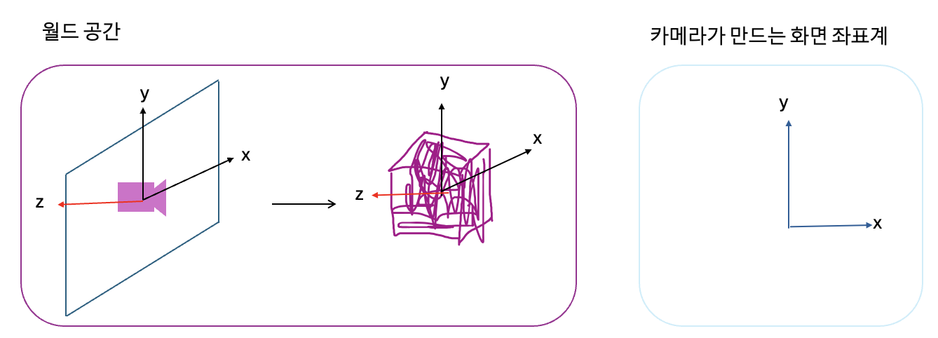 - 월드에서의 좌표가 어떻든 카메라 관점에서 봤을 때 카메라는 세상의 좌표와 다르게 반대로 바라보는 모습이 될것