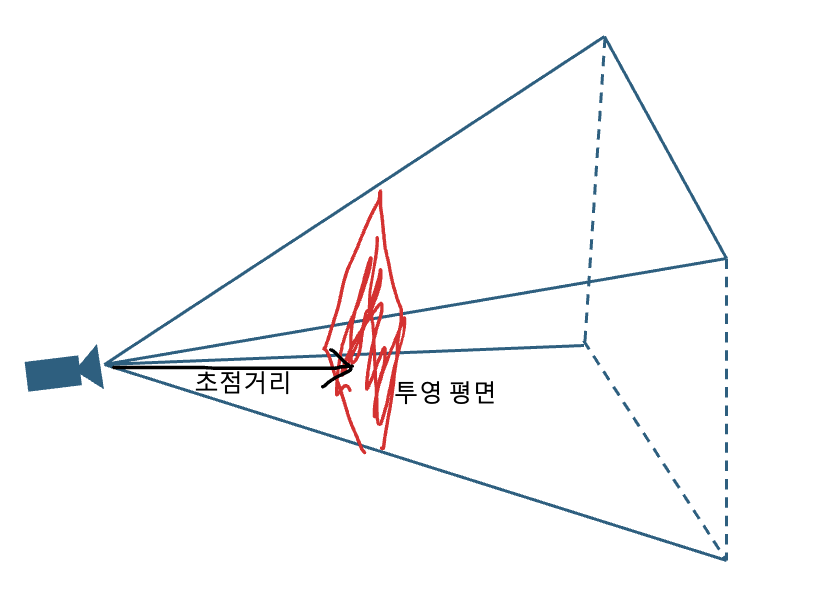 - 투영 평면의 위치를 지정하기 위해 설정한 카메라로부터 투영 평면까지의 거리를 초점 거리(Focal length)라고 한다.