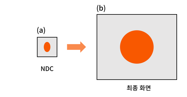 - 위 그림의 (a)와 같이 NDC에 원을 투영할 때 종횡비를 거꾸로 뒤집은 비율을 적용해 먼저 찌그러트린다.