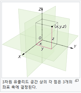 - 이렇게 세 축이 모두 직교하는 공간을 유클리드 공간(Euclidean space)이라고 한다.