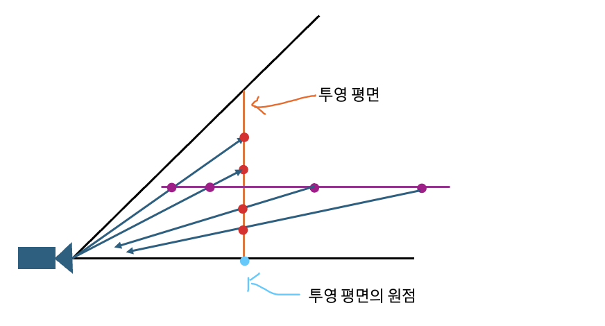 - 투영 평면의 개념은 위 그림과 같으며 투영 평면의 위치가 카메라로부터 멀어질수록 투영 평면은 더 커진다.