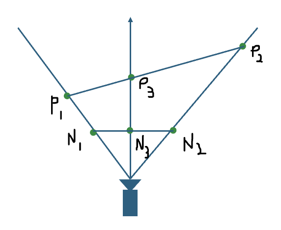 - NDC공간에서 점 N_1과 N_2를 이어 선분을 생성했을 때 선분의 중앙에 위치한 중점 N_3의 무게중심좌표는 0.5가 된다.
