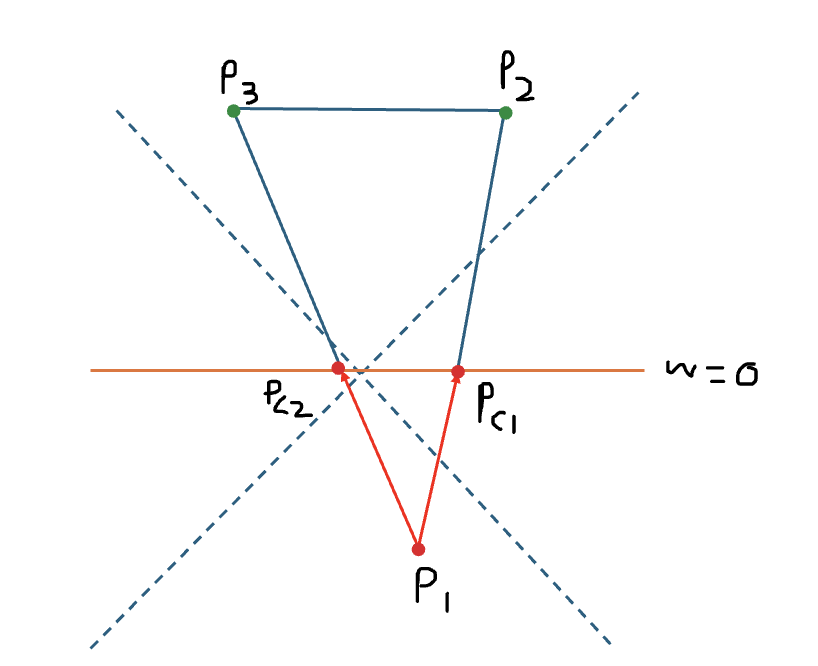 - 문제 해결을 위해 음의 w 영역에 걸쳐 있는 삼각형을 파악하고 이들이 엉뚱하게 투영되지 않도록 삼각형 영역을 잘라내야 한다.
