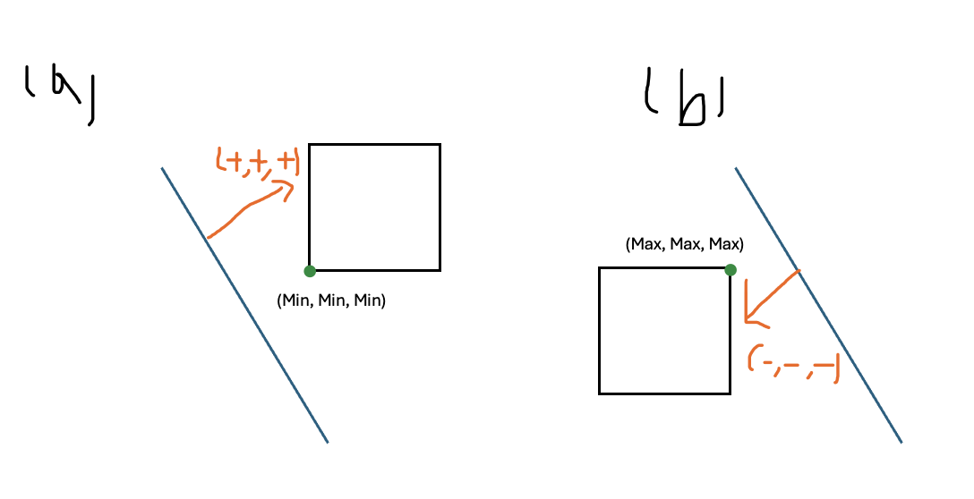 - x축과 z축의 법선 벡터가 음수이고 y축만 양수라면 평면과 가장 가까운 AABB의 좌표는 (Max, Min, Max)가 된다.