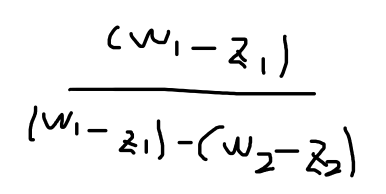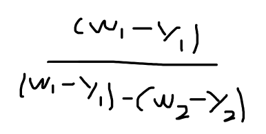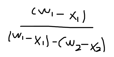 t_1 = (w_1 - x_1) / ((w_1 - x_1) - (w_2 - x_2))