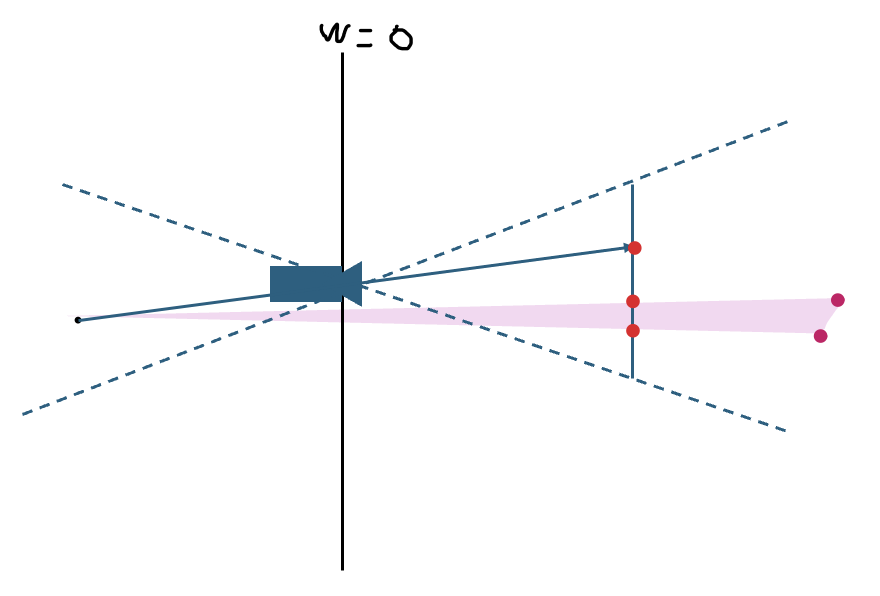 - 따라서 카메라 정면에 위치한 점의 w값은 0보다 크고, 카메라 뒤에 있는 점의 w값은 0보다 작으며, 카메라 초점에 위치한 점의 w 값은 0이 된다.