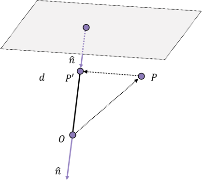 - p가 양수이면 벡터 OP'은 법선 벡터와 같은 방향을 향하고, 음수이면 반대 방향을 향한다.