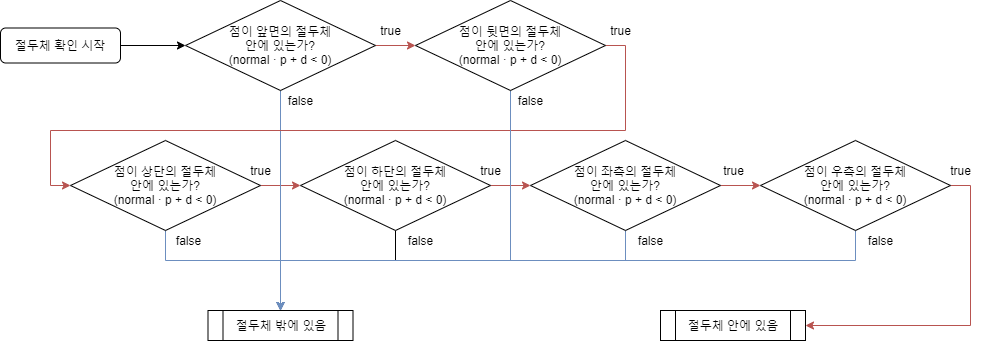 - 평면에서 가장 가까운 AABB의 좌표와 평면과의 차이를 측정했을 때 그 값이 양수가 나온다면, AABB 영역은 완전히 평면의 바깥쪽에 위치해 있다고 판정할 수 있다.