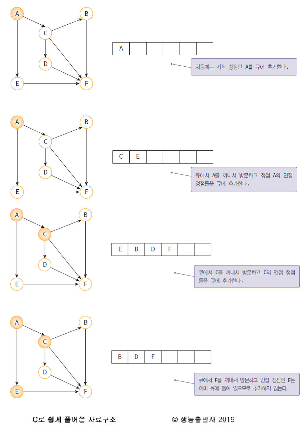 - 시작 정점으로부터 가까운 정점을 먼저 방문하고 멀리 떨어져 있는 정점을 나중에 방문하는 순회 방법